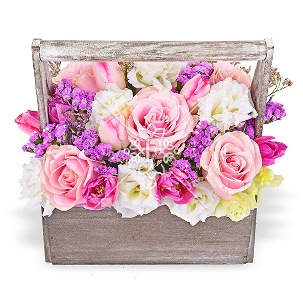 роза розовая - 6 шт., тюльпан розовый - 5 шт., эустома белая - 3 шт., тюльпан темно-розовый - 9 шт., зелень декоративная, оазис, ящик (корзинка). Примерный размер:35Х35 см.